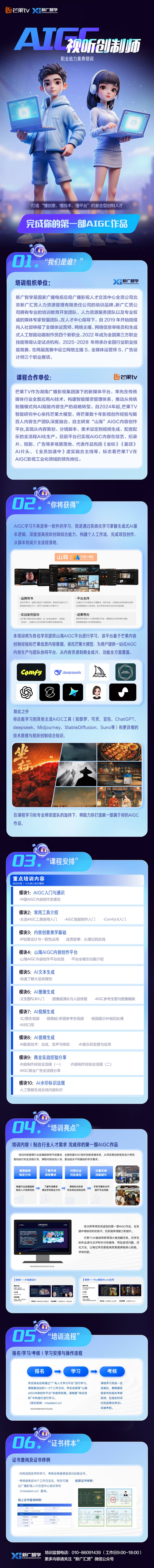 作为人才中心职业培训品牌【新广智学】的最新项目,致力于培养“懂创意、懂技术、懂平台”的复合型视听创制人才,构建以“能力提升 + 实战驱动”为核心的AIGC人才培养体系。课程突破传统单一软件教学,帮助学员系统掌握生成式AI的基本逻辑,全面提升视听创制综合能力,构建个人工作流,实现从脚本到成片的完整项目落地。