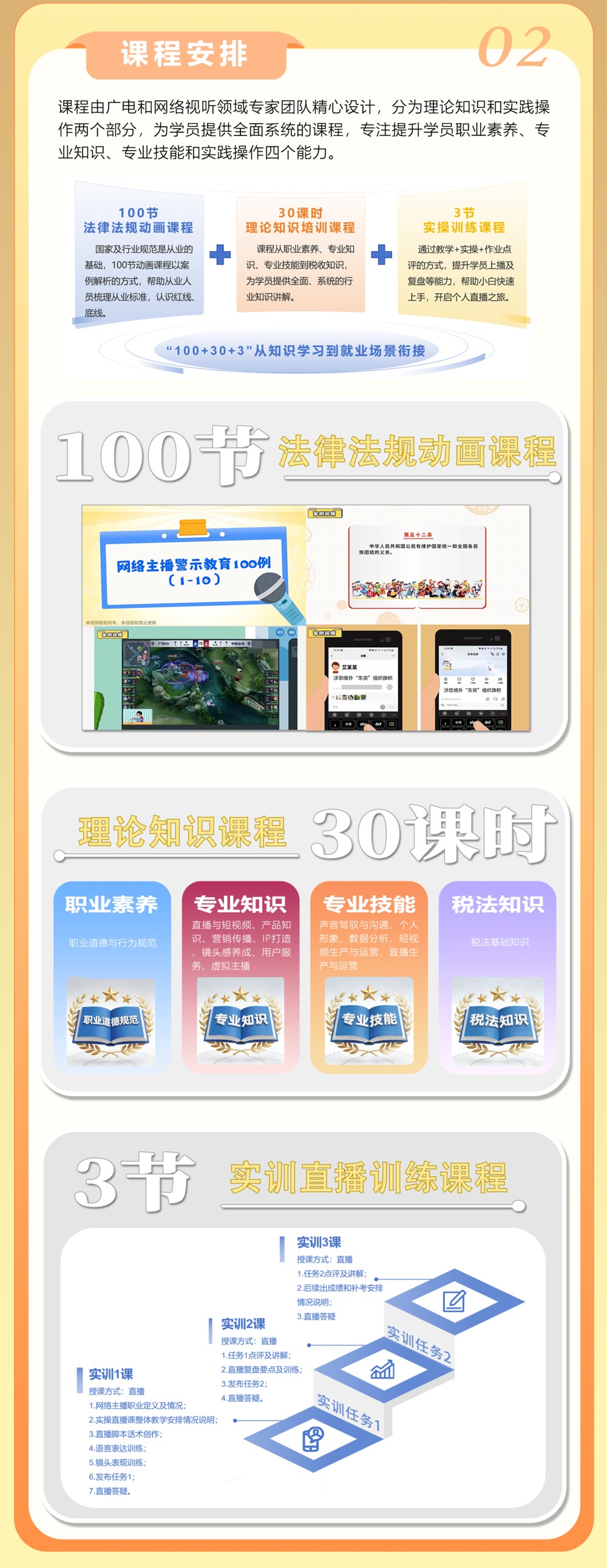 培训聚焦实效教学,构建了包含“专业理论知识学习、实操直播带练、针对性点评及答疑”三大核心模块,旨在帮助学员掌握行业法规与不同媒体平台特性及适用场景,夯实职业素养、直播话术、脚本创作、数据分析等专业技能的同时,拓宽行业认知视野,熟悉电商带货、知识分享等多类型主播岗位要求,提升学员综合从业能力、助力职业发展。
