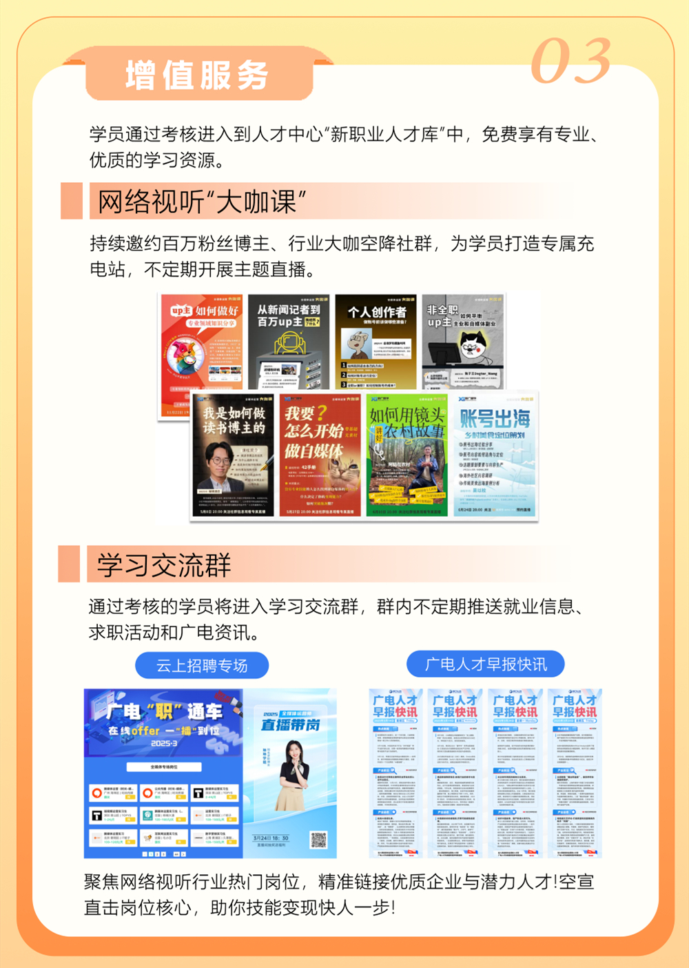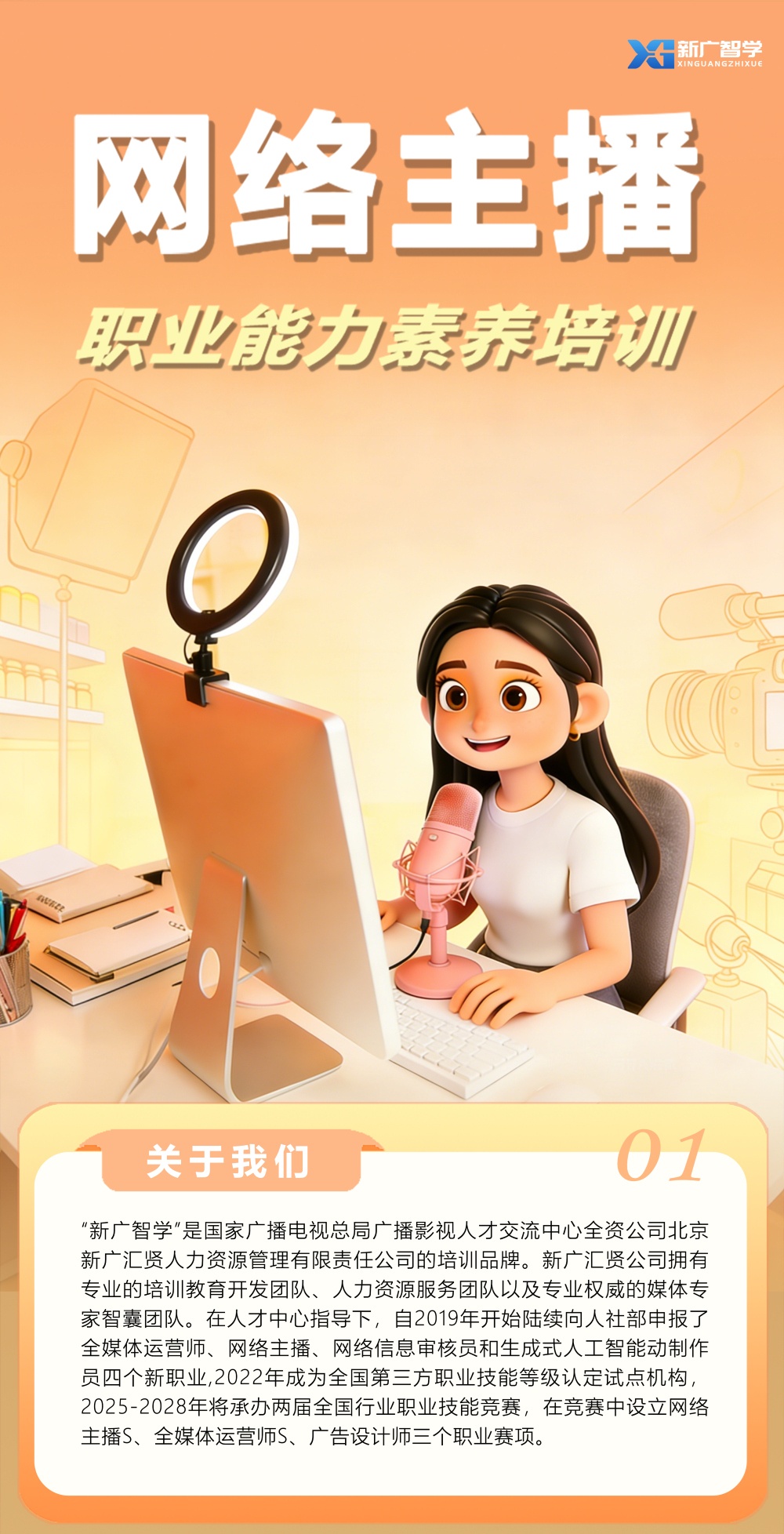为贯彻落实广播电视和网络视听人才培养战略,强化短视频、直播等新兴媒体形态运营知识的系统学习,自2019年起,在广播影视人才交流中心(以下简称人才中心)指导下,北京新广汇贤人力资源管理有限责任公司(以下简称新广汇贤公司)着手组织运营网络视听新职业人才培养工作。2025年初,新广汇贤公司打造“新广智学”人才培训服务品牌,并正式发布网络主播职业能力素养培训项目。